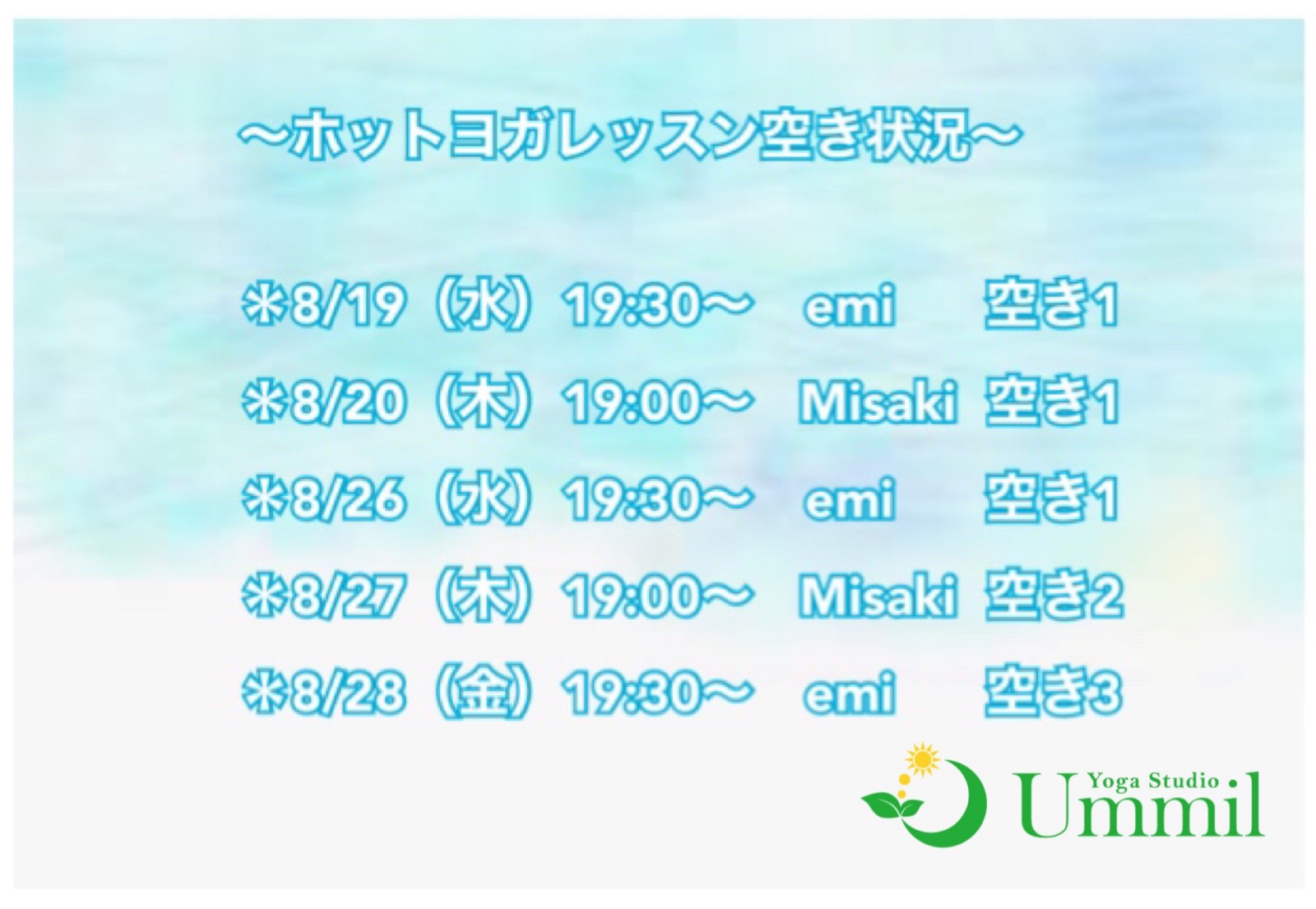~8月ホットヨガ空き状況~ 〜ホットヨガレッスン空き状況〜 8月のホットヨガレッスン空き状況です♪ どちらも残席少しあります◎ ご都合合う方はお電話、ラインからご連絡下さい🙏 お知らせ 2020/08/19 ummil タグ:ホットヨガ