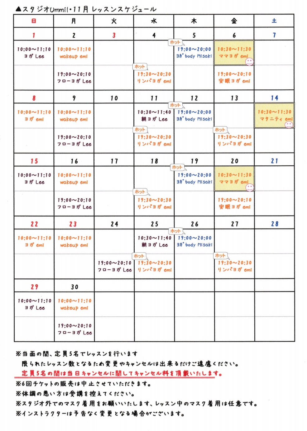 11月のレッスンスケジュールです😃