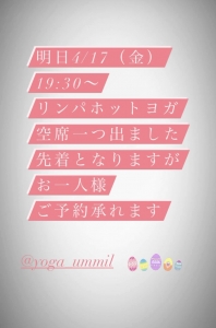 明日4/17残席出ました 明日4/17(金曜日) 19:30からのリンパホットヨガ 空席一つ出ましたので ご都合合う方、ご予約承れます♪ 初めての方も大歓迎です☺️ お知らせ 2021/04/15 ummil タグ:ホットヨガ