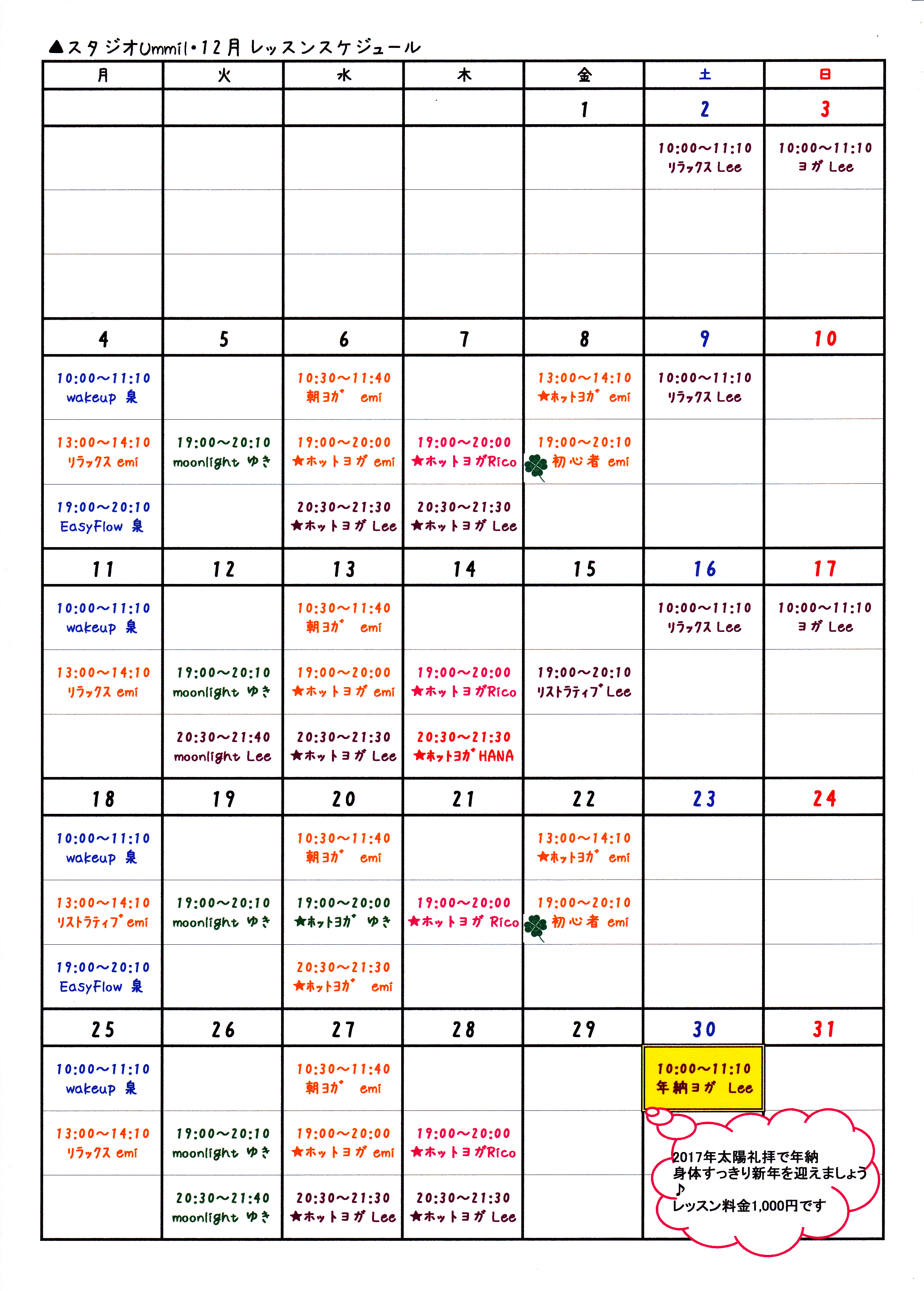 12月レッスンスケジュール